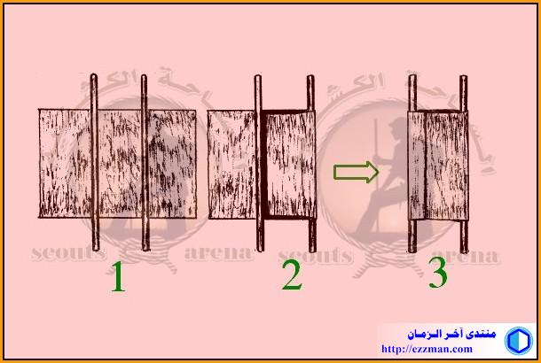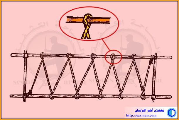 بعدها نقوم بلف الحبل على الهيكل بطريقة متقاطعة ومتعاكسة كما في الصورة مع الشد الجيد للحبل الذي يجب ان يكون من نوعية جيدة لنشكل مسندا نضع عليه المصاب ..