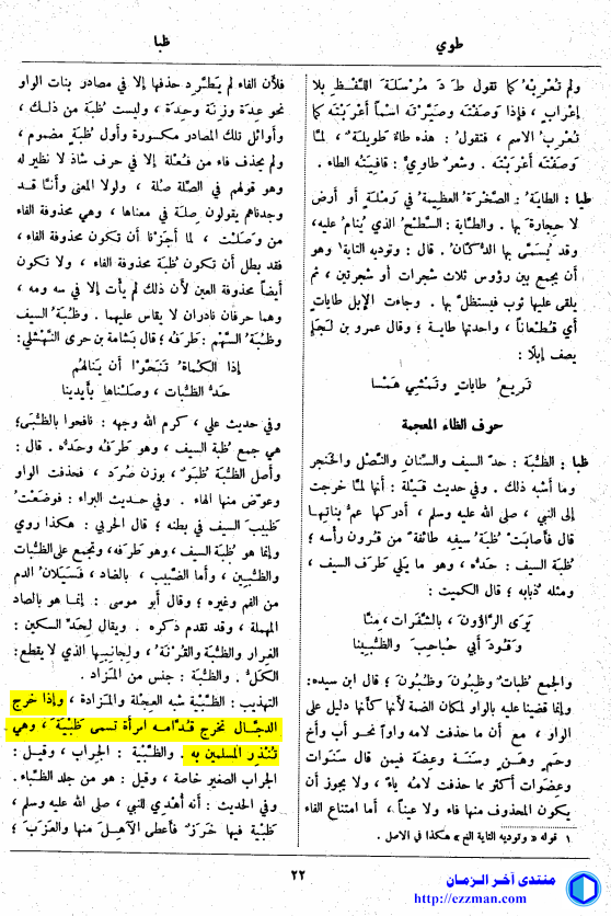 جاء في لسان العرب للإمام العلامة أبي الفضل جمال الدين محمد بن مكرم ابن منظور الإفريقي المصري في مجلّده الخامس عشر الصادر عن دار صادر بيروت (غير مذكور السنة) (الصفحة 22 ) ما يلي :