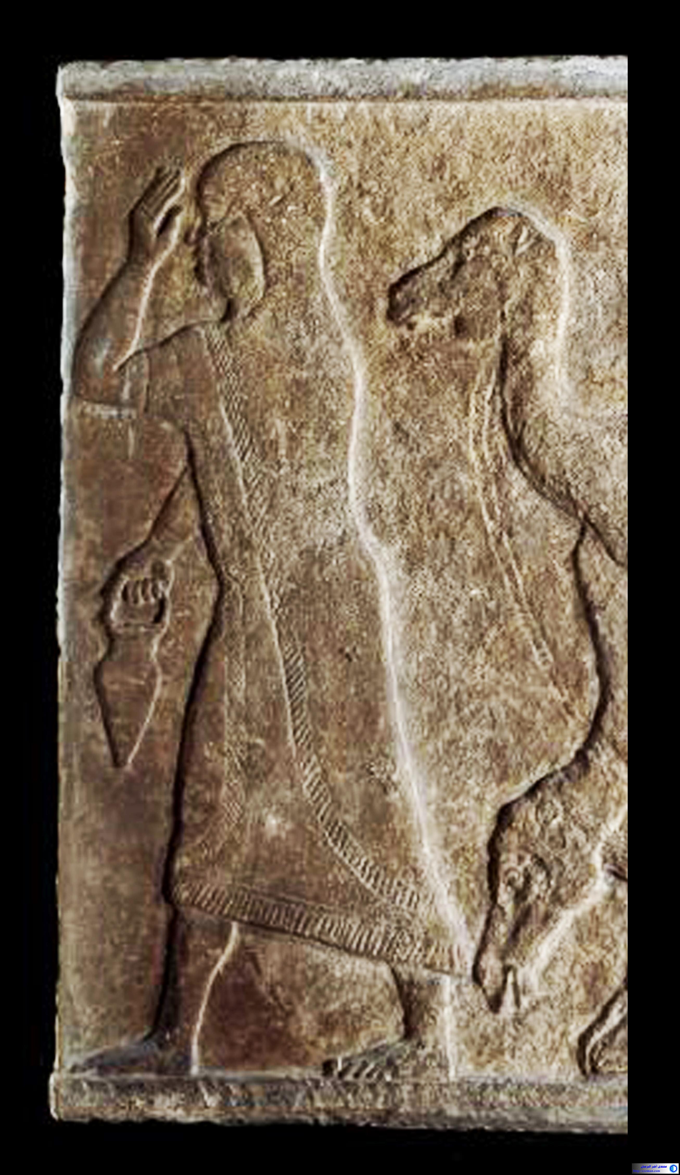 Gypsum wall panel relief: a captive woman leads a group of four camels. Her dress consists of a long fringed garment with short sleeves and a fringed cloak which covers the head after the fashion of Syrian women. She wears triple bracelets on both wrists, and carries in her right hand a beautifully formed vase with pointed base and a round handle. Her left hand touches her forehead in sign of submission (or despair?). The left hindlegs of the last two camels are misrepresented as if single legs. The grouping and drawing of the animals makes this the best of the slabs representing camels. The procession of prisoners and booty represents those captured during one of Tiglath-Pileser III's campaigns against Arab enemies. It is in very bad condition on the right side, largely owing to the action of salt on a broken surface, so that many details are lost and at the extreme edge the whole surface is ruined.