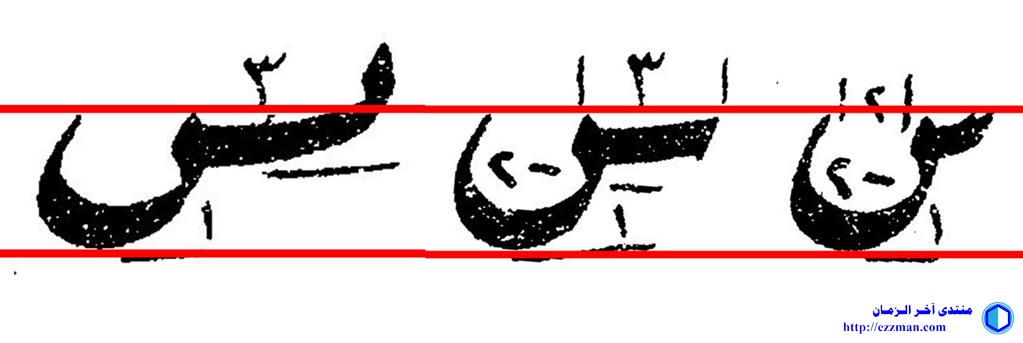 باستثناء السن المرتفعة أول حرف السين، فتكتب مرتفعة فوق خط المستوى، ثم يبدأ كتابة أول حرف السين أسفل خط المستوى.