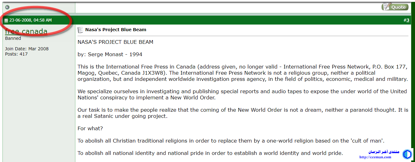 إذن مطلوب المقال الأصلي من المصدر الذي نشرته الوكالة الدولية للصحافة الحرة الكندية كمرجع، عثرت على بعض نشراتها وهي مميزة كأنها مكتوبة بالألة الكاتبة..!!
