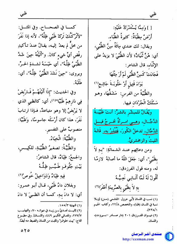 بسم الله الرحمن الرحيم وبه نستعين جاء في كتاب أساس البلاغة لمؤلفه أبي القاسم جار الله محمود بن عمر بن أحمد الزمخشري المتوفى سنة 538 هجرية ومحققه محمد باسل عيون السود في جزئه الأول وطبعته الأولى الصادرة عن دار الكتب العلمية بلبنان عام 1998 (الصفحة 622) ما يلي: جاء في تاج العروس من جواهر القاموس لمؤلفه السيد محمد مرتضى الحسيني الزبيدي ومحققه د عبد الصبور شاهين في جزئه الثامن والثلاثين وطبعته الأولى الصادرة بالكويت عام 2001 (الصفحة 525) ما يلي : جاء في تهذيب اللغة لمؤلفه أبي منصور محمد بن أحمد الأزهري ومشرفه محمد عوض مرعب في مجلده الرابع عشر وطبعته الأولى الصادرة عن دار إحياء التراث العربي ببيروت عام 2001 (الصفحة 286) ما يلي : جاء في لسان العرب للإمام العلامة أبي الفضل جمال الدين محمد بن مكرم ابن منظور الإفريقي المصري في مجلّده الخامس عشر الصادر عن دار صادر بيروت (غير مذكور السنة) (الصفحة 22 ) ما يلي : |