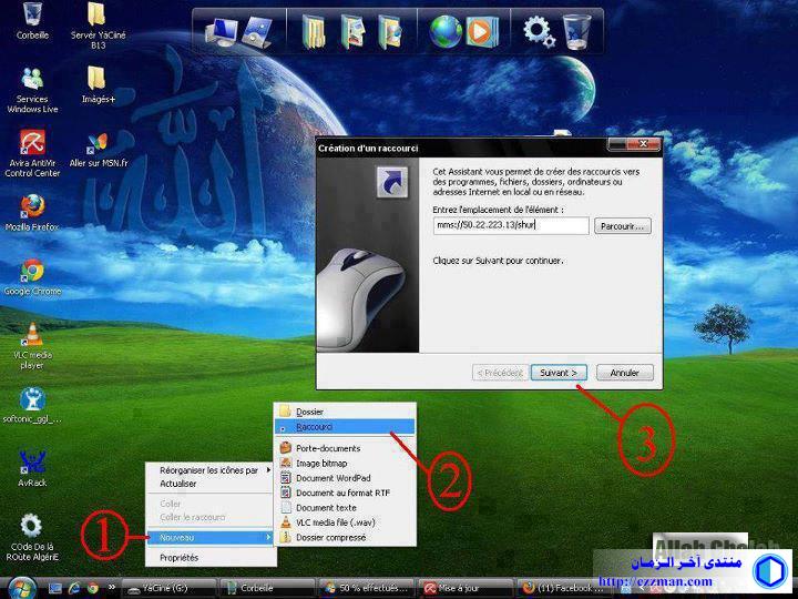 اذهب لسطح المكتب (Desktop) و اضغط باليمين (New) ثم اختار Shortcut سيظهر لك نافذة بها مستطيل ... الصق أحد هذه الروابط: الإذاعة العامة - إذاعة متنوعة لمختلف القراء mms://50.22.223.13/radio إذاعة القارئ ماهر المعيقلي mms://50.22.223.13/maher إذاعة القارئ أحمد العجمي mms://50.22.223.13/ajm إذاعة القارئ سعود الشريم mms://50.22.223.13/shur إذاعة القارئ عبدالباسط عبدالصمد mms://50.22.223.13/basit إذاعة القارئ عبدالرحمن السديس mms://50.22.223.13/sds إذاعة القارئ سعد الغامدي mms://50.22.223.13/s_gmd إذاعة القارئ محمد صديق المنشاوي mms://50.22.223.13/minsh إذاعة القارئ عبدالباسط عبدالصمد - المصحف المجود mms://50.22.223.13/basit_mjwd إذاعة القارئ مشاري العفاسي mms://50.22.223.13/afs إذاعة القارئ خالد القحطاني mms://50.22.223.13/qht إذاعة القارئ ناصر القطامي mms://50.22.223.13/qtm إذاعة القارئ فارس عباد mms://50.22.223.13/frs_a إذاعة القارئ إدريس أبكر mms://50.22.223.13/abkr إذاعة القارئ ياسر الدوسري mms://50.22.223.13/yasser إذاعة القارئ شيخ أبو بكر الشاطري mms://50.22.223.13/shatri ثم اضغط next ثم سميها بالاسم الموجود فوق الرابط ثم اضغط finish ستجد علي سطح المكتب أيقونة مثل أيقونة "الميديا بلاير" او "الريال بلير" اضغط عليها واستمع للإذاعات التى أضفتها منـــــقول
