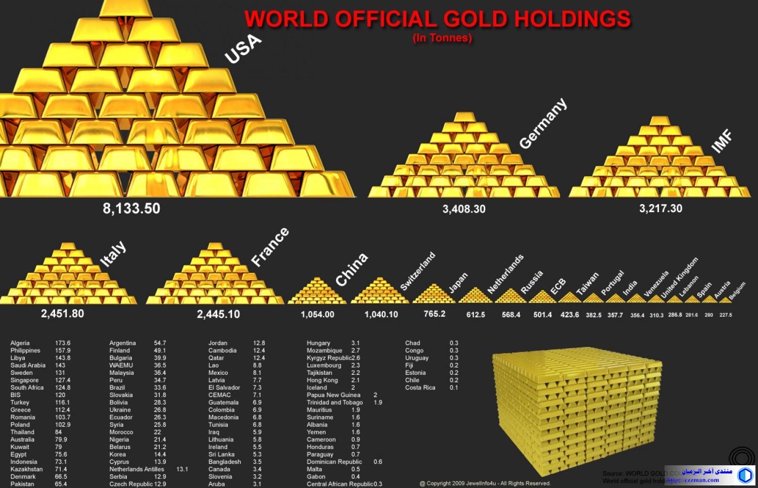 [justify]هذا رسم يبين إحتياط كل دولة من الذهب يعني كم تملك كل دولة من الذهب و نلاحظ أن دولة الولايات المتحدة الأمريكية و ألمانيا و صندوق النقد الدولي و دولة إطاليا و فرنسا هم الذين يحتلون المرتبة الأولى. |