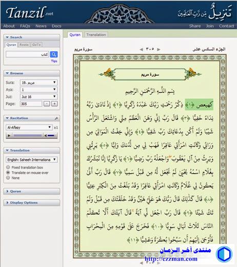 هذا رابط أيضا مع إمكانية البحث والترجمة والإستماع والتفسير أيضا. آمل أن يكون مفيدا لجميع المسلمين http://tanzil.net/#37:24 |