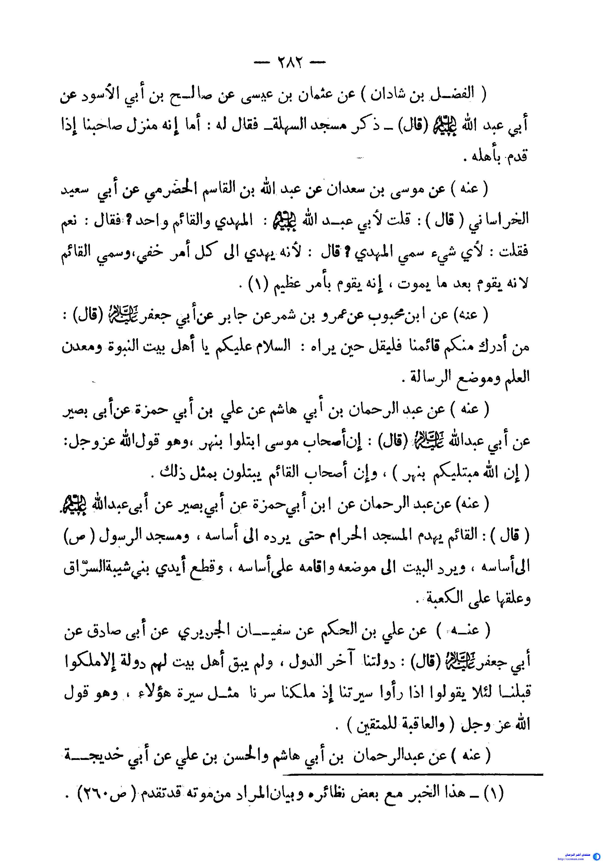 وجدت هذا النص عند الشيعة يذكر فيه هدم المسجد الحرام في آخر الزمان، ويقول أن المهدي هو من يقوم بذلك!! والنصوص عندهم لا تسلم من التحريف فنسبوا تعصبا منهم ماذكر عن المهدية عليها السلام (للمهدي أوالقائم) وبعض الغلو، فيستأنس من ذلك أن المهدية عليها السلام هي من سوف تهدم المسجد الحرام، ولا سبب لهدم المسجد الا أن تطهره، سنة جدها ابراهيم عليه السلام، فلا يعقل أن تهدم المسجد الحرام صدا عن سبيل الله والمسجد الحرام. (إِنَّ الَّذِينَ كَفَرُوا وَيَصُدُّونَ عَن سَبِيلِ اللَّـهِ وَالْمَسْجِدِ الْحَرَامِ الَّذِي جَعَلْنَاهُ لِلنَّاسِ سَوَاءً الْعَاكِفُ فِيهِ وَالْبَادِ ۚ وَمَن يُرِدْ فِيهِ بِإِلْحَادٍ بِظُلْمٍ نُّذِقْهُ مِنْ عَذَابٍ أَلِيمٍ ﴿٢٥﴾ وَإِذْ بَوَّأْنَا لِإِبْرَاهِيمَ مَكَانَ الْبَيْتِ أَن لَّا تُشْرِكْ بِي شَيْئًا وَطَهِّرْ بَيْتِيَ لِلطَّائِفِينَ وَالْقَائِمِينَ وَالرُّكَّعِ السُّجُودِ ﴿٢٦﴾)[سورة الحج] النص الأول: [-عنه، عن موسى بن سعدان، عن عبد الله بن القاسم الحضرمي، عن أبي سعيد الخراساني قال: قلت لأبي عبد الله عليه السلام: المهدي والقائم واحد؟ فقال: نعم. فقلت: لأي شئ سمي المهدي؟ قال: لأنه يهدي إلى كل أمر خفي، وسمي القائم لأنه يقوم بعدما يموت، إنه يقوم بأمر عظيم.][1]النص الثاني: [-عنه، عن عبد الرحمان، عن ابن أبي حمزة، عن أبي بصير، عن أبي عبد الله عليه السلام قال: القائم يهدم المسجد الحرام حتى يرده إلى أساسه، ومسجد الرسول صلى الله عليه وآله إلى أساسه، ويرد البيت إلى موضعه، وأقامه على أساسه، وقطع أيدي بني شيبة السراق وعلقها على الكعبة]. [1] وقال البخاري ومسلم في صحيحيهما: حدثنا يحيى بن يحيى، أخبرنا أبو معاوية، عَنْ هِشَامِ بْنِ عُرْوَةَ، عَنْ أَبِيهِ، عَنْ عَائِشَةَ قَالَ: قَالَ رَسُولُ اللَّهِ صَلَّى اللَّهُ عَلَيْهِ وسلم: (لولا حداثة عهد قومك بالكفر لنقضت الكعبة ولجعلتها على أساس إبراهيم، فإن قريشا حين بنت البيت استقصرت، ولجعلت لها خلفا).[2] وجاء كذلك في مسند أحمد: - حَدَّثَنَا عَبْدُ الرَّحْمَنِ، حَدَّثَنَا سَلِيمُ بْنُ حَيَّانَ، عَنْ سَعِيدِ بْنِ مِينَاءَ، قَالَ: سَمِعْتُ ابْنَ الزُّبَيْرِ، يَقُولُ: حَدَّثَتْنِي خَالَتِي عَائِشَةُ، أَنَّ رَسُولَ اللهِ صَلَّى اللهُ عَلَيْهِ وَسَلَّمَ قَالَ لَهَا: (لَوْلَا أَنَّ قَوْمَكِ حَدِيثُ عَهْدٍ بِشِرْكٍ، أَوْ بِجَاهِلِيَّةٍ، لَهَدَمْتُ الْكَعْبَةَ، فَأَلْزَقْتُهَا بِالْأَرْضِ، وَجَعَلْتُ لَهَا بَابَيْنِ، بَابًا شَرْقِيًّا وَبَابًا غَرْبِيًّا، وَزِدْتُ فِيهَا مِنَ الْحَجَرِ سِتَّةَ أَذْرُعٍ، فَإِنَّ قُرِيشًا اقْتَصَرَتْهَا حِينَ بَنَتِ الْكَعْبَةَ) [3] رابط الصفحة 282 من كتاب الغيبة : https://archive.org/download/282_202...0%D8%B5282.pdf ___________ [1] الغيبة للطوسي/ أبي جعفر محمد بن الحسن الطوسي/ توفى 460 هـ/ ت: الشيخ آغا بزرك الطهراني/ مكتبة نينوى – طهران؛ الطبعة: الثانية 1385 هـ/ ص 282.
