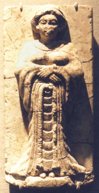 وهذا تمثال من (جزيرة قبرص) أواخر القرن السادس قبل الميلاد امرأة جالسة وتضع طفل على حجرها، لاحظ أن خمارها مفتوح وينزل من أعلى الرأس إلي منتصف ساقها، فلما جاء الإسلام أمر بضرب الخمار على الجيب، فصار الخمار مغلقا من أمام وليس مفتوحا كما في التمثال. وهذا يعني أن الخمار كان زيا للنساء خارج جزيرة العرب أيضا.