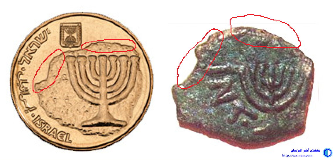 وقد زعم البنك الإسرائيلي أن لها قيمة تاريخية وأنها نسخة عن قطعة نقدية أثرية تعود لفترة ( 37-40 ق.م ) صكها ( Mattathias Antigonus ). الإختلاف واضح بين الشكلين ولو أنها كانت نسخة مطابقة كما زعموا لما غيروا أدنى جزئية فيها. نلاحظ أن المدينة تدخل في الخريطة. اقتباس: