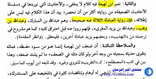 في إسناد الأثر كل من: ابن وهب، ابن لهيعة، ابو الأسود، عروة ابن الزبير. من سير أعلام النبلاء: - عروة ابن الزبير: "عروة ابن حواري رسول الله صلى الله عليه وسلم وابن عمته صفية الزبير بن العوام بن خويلد بن أسد بن عبد العزى بن قصي بن كلاب. الإمام عالم المدينة أبو عبد الله القرشي الأسدي المدني الفقيه أحد الفقهاء السبعة" _______________ - أبو الأسود: "62 - أَبُو الأَسْوَدِ مُحَمَّدُ بنُ عَبْدِ الرَّحْمَنِ الأَسَدِيُّ * (ع) ابْنِ نَوْفَلِ بنِ الأَسْوَدِ بنِ نَوْفَلِ بنِ خُوَيْلِدِ بنِ أَسَدِ بنِ عَبْدِ العُزَّى بنِ قُصَيٍّ، الإِمَامُ، أَبُو الأَسْوَدِ القُرَشِيُّ، الأَسَدِيُّ، يَتِيْمُ عُرْوَةَ. وَكَانَ أَبُوْهُ أَوْصَى بِهِ إِلَى عُرْوَةَ، وَكَانَ جَدُّه أَحَدَ السَّابِقِيْنَ، وَمِنْ مُهَاجِرَةِ الحَبَشَةِ - أَعْنِي نَوْفَلاً - وَبِأَرْضِ الحَبَشَةِ تُوُفِّيَ، فَيَقْتَضِي أَنْ يَكُوْنَ وَلَدُه عَبْدُ الرَّحْمَنِ مِنْ صِغَارِ الصَّحَابَةِ. نَزَلَ أَبُو الأَسْوَدِ مِصْرَ، وَحَدَّثَ بِهَا بِكِتَابِ (المَغَازِي) لِعُرْوَةَ بنِ الزُّبَيْرِ، عَنْهُ. وَرَوَى عَنْ: عَلِيِّ بنِ الحُسَيْنِ، وَالنُّعْمَانِ بنِ أَبِي عَيَّاشٍ، وَعِكْرِمَةَ، وَطَائِفَةٍ. وَعَنْهُ: حَيْوَةُ بنُ شُرَيْحٍ، وَشُعْبَةُ بنُ الحَجَّاجِ، وَمَالِكُ بنُ أَنَسٍ، وَابْنُ لَهِيْعَةَ، وَأَنَسُ بنُ عِيَاضٍ اللَّيْثِيُّ، وَآخَرُوْنَ. وَهُوَ مِنَ العُلَمَاءِ الثِّقَاتِ. عِدَادُه فِي صِغَار التَّابِعِيْنَ. مَاتَ: سَنَةَ بِضْعٍ وَثَلاَثِيْنَ وَمائَةٍ."ّ ________________ ابن لهيعة: قلت: اختلفوا فيه، في الرابطين التاليين أقوال متخصصين: موقع أهل الحديث، بحث بعنوان "تقوية قول جمهور المحدثين في ابن لهيعة المصري" وفي البحث الأخير جاء: "روايته في الكتب الستة: روايته في سنن الترمذي وأبي داود وابن ماجه وروى له مسلم مقرونا بغيره. وروى البخاريُّ في «الفتن» من «صحيحه» عن المقرىء، عن حيوة، وغيرِه، عن أبـي الأسود: «قُطع علىٰ أهلِ المدينةِ بَعثٌ فاكتتبت فيه فبلغ عكرمة» الحديث. وفي تفسير سورة البقرة: {وقاتلوهم حتى لا تكون فتنة}(1)(1). وزاد عثمان بن صالح، عن ابن وهب، قال: أخبرني فلان وحيوة بن شريح، عن بكر بن عَمرو، عن بُكَير بن الأشج، عن نافع، عن ابن عُمر حديث «بُني الإسلامُ على خَمْس»، وفي «الاعتصام» عن سعيد بن تَلِيد، عن ابن وَهْب، عن عبد الرَّحمٰن بن شُرَيح وغيره، عن أبـي الأسود، عن عروة، عن عبد الله بن عَمرو «إنَّ الله لا ينزع العلم»، وفي تفسير سورة النساء، وفي آخر الطلاق، وفي غير موضع فقال أبو عبد الله بن يربوع الإشبـيليُّ: أنه ابن لهيعة في هذه المواضع كلها. وروى النَّسائيُّ أحاديث كثيرة من روايـية ابن وَهْب وغيره يقول فيها عن عَمرو بن الحارث، وذكر آخر: وعن فلان، وذكر آخر، ونحو ذلك. وجاء كثير من ذلك مُبَـيّناً في رواية غيره أنه ابن لَهِيعة."ا.هـ ويصححه الألباني بشرط؛ إذ قال في سلسلة الأحاديث الصحيحة الجزء الثاني صفحة 24: وصححه أحمد شاكر. ______________ من سير أعلام النبلاء: "63 - عَبْدُ اللهِ بنُ وَهْبِ بنِ مُسْلِمٍ الفِهْرِيُّ مَوْلاَهُمْ * (ع) الإِمَامُ، شَيْخُ الإِسْلاَمِ، أَبُو مُحَمَّدٍ الفِهْرِيُّ مَوْلاَهُمْ، المِصْرِيُّ، الحَافِظُ." ______________ وعليه وحسب قول الألباني وأحمد شاكر في "ابن هليعة" فإن الأثر صحيح لا غبار عليه. يُصَدَّق الحق أو يُكذَّب بناء على أراء بشر في بشر نبرأ إلى الله تعالى من هذا العلم الفاسد |