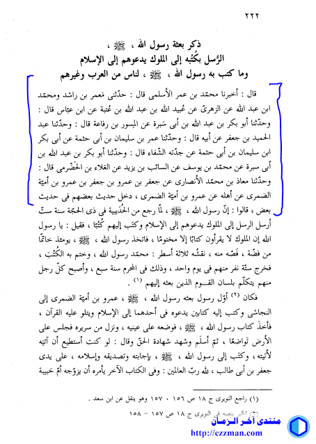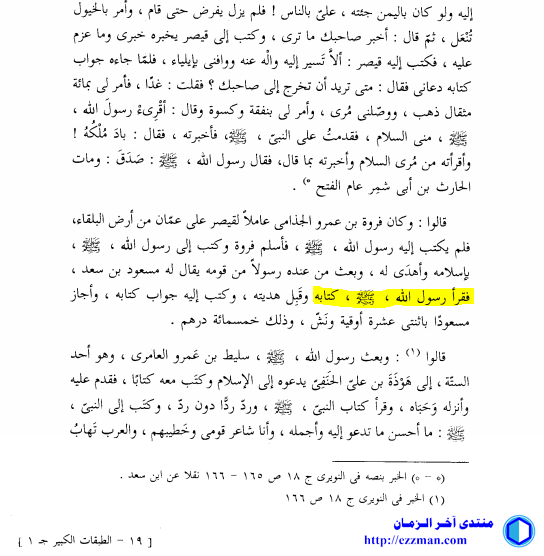 "قَالُوا: وَكَانَ فَرْوَةُ بْنُ عَمْرٍو الْجُذَامِيُّ عَامِلا لِقَيْصَرَ عَلَى عُمَانَ مِنْ أَرْضِ الْبَلْقَاءِ. فَلَمْ يَكْتُبْ إِلَيْهِ رَسُولُ اللَّهِ - صَلَّى اللَّهُ عَلَيْهِ وَسَلَّمَ - فَأَسْلَمَ فَرْوَةُ وَكَتَبَ إِلَى رَسُولِ اللَّهِ - صَلَّى اللَّهُ عَلَيْهِ وَسَلَّمَ - بِإِسْلامِهِ وَأَهْدَى لَهُ. وَبَعَثَ مِنْ عِنْدِهِ رَسُولا مِنْ قَوْمِهِ يُقَالُ لَهُ مَسْعُودُ بْنُ سَعْدٍ. فَقَرَأَ رَسُولُ اللَّهِ. ص. كِتَابَهُ وَقَبِلَ هَدِيَّتَهُ. وَكَتَبَ إِلَيْهِ جَوَابَ كِتَابِهِ. وأجاز مسعودا باثنتي عشرة أوقية ونش. وَذَلِكَ خَمْسُمِائَةِ دِرْهَمٍ."ا.هـ [1] بالنسبة للرواة فقد ذكر الكاتب نفرا منهم في مقدمة المطلب المعنون بـ [ذكر بعثة رسول الله صلى الله عليه وسلم الرسل بكتبه إلى الملوك يدعوهم إلى الإسلام وما كتب به رسول الله صلى الله عليه وسلم لناس من العرب وغيرهم]، وأتبعهم بقول "دخل حديثهم في حديث بعض" ثم قدّم كلمة "قالوا" بداية كل رواية. النسخة المطبوعة للطبقات الكبرى لابن سعد طبعة مكتبة الخانجي 1421 هـ/ 2001 م، ج1 ص 225. http://ezzman.com/up/do.php?img=5015 http://ezzman.com/up/do.php?img=5016 http://ezzman.com/up/do.php?img=5017 _________ [1] كتاب الطبقات الكبرى، ج1 ص 201، ط العلمية (نسخة الشاملة انظر هنا) |