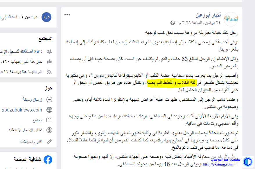 نشر خبر وفاة امرأة بسبب بكتريا مصدرها لعاب الكلاب بجريدة سي بي اس أطلنطا سجلت بتاريخ 05سبتمر 2012 و ممكن أن تكون قد سجلت حالات أقدم منها.