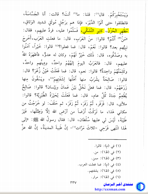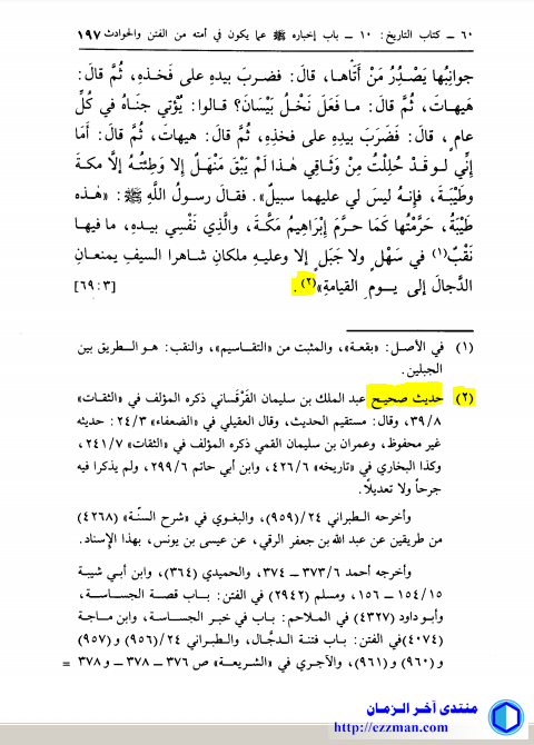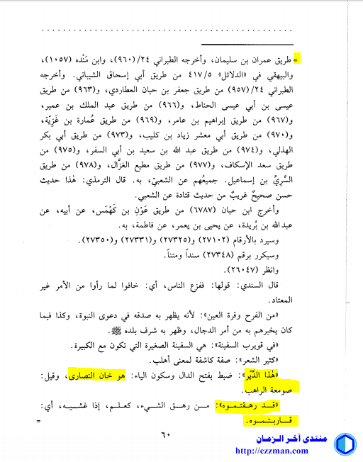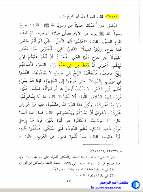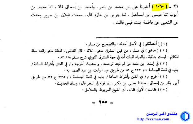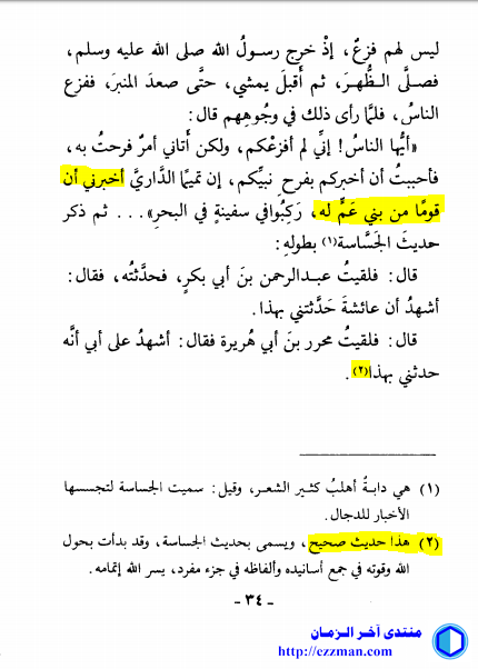 متون الحديث (96) كتب الألباني (19) الأجزاء الحديثية (13) مخطوطات حديثية (11) ______________________ النص الأول: [2289 - حَدَّثَنَا أَحْمَدُ بْنُ عُبَيْدِ اللَّهِ قَالَ: نا إِبْرَاهِيمُ بْنُ مُحَمَّدٍ الْحَنَفِيُّ قَالَ: نا عَبْدُ اللَّهِ بْنُ دَاوُدَ الْخُرَيْبِيُّ، عَنْ سَعْدٍ الْإِسْكَافِ، عَنِ الشَّعْبِيِّ، عَنْ فَاطِمَةَ بِنْتِ قَيْسٍ، أَنَّ النَّبِيَّ صَلَّى اللهُ عَلَيْهِ وَسَلَّمَ خَطَبَ فَقَالَ: «§حَدَّثَنِي تَمِيمٌ الدَّارِيُّ، أَنَّهُ رَكِبَ الْبَحْرَ فِي أُنَاسٍ مِنْ أَهْلِهِ، فَأَلْجَأَتْهُمُ الرِّيحُ إِلَى جَزِيرَةٍ فِي الْبَحْرِ، فَإِذَا هُمْ بِدَابَّةٍ أَهْلَبَ، فَقَالُوا: مَا أَنْتِ؟ فَقَالَتْ: أَنَا الْجَسَّاسَةُ» فَذَكَرَ حَدِيثَ الْجَسَّاسَةِ] ا.هـ - في هذه الرواية جاء أنه خرج في أناس من أهله (الطبراني، المعجم الأوسط، ج2 ص382، هنا) النسخة المطبوعة من المعجم الأوسط، المحقق: طارق بن عوض الله بن محمد أبو معاذ - محسن الحسيني، الناشر: دار الحرمين، 1415هـ - 1995م: _________________________ النص الثاني: [120 - (2942) حَدَّثَنَا يَحْيَى بْنُ حَبِيبٍ الْحَارِثِيُّ، حَدَّثَنَا خَالِدُ بْنُ الْحَارِثِ الْهُجَيْمِيُّ أَبُو عُثْمَانَ، حَدَّثَنَا قُرَّةُ، حَدَّثَنَا سَيَّارٌ أَبُو الْحَكَمِ، حَدَّثَنَا الشَّعْبِيُّ، قَالَ: دَخَلْنَا عَلَى فَاطِمَةَ بِنْتِ قَيْسٍ، فَأَتْحَفَتْنَا بِرُطَبٍ يُقَالُ لَهُ رُطَبُ ابْنِ طَابٍ، وَأَسْقَتْنَا سَوِيقَ سُلْتٍ، فَسَأَلْتُهَا عَنِ الْمُطَلَّقَةِ ثَلَاثًا أَيْنَ تَعْتَدُّ؟ قَالَتْ: طَلَّقَنِي بَعْلِي ثَلَاثًا، فَأَذِنَ لِي النَّبِيُّ صَلَّى اللهُ عَلَيْهِ وَسَلَّمَ أَنْ أَعْتَدَّ فِي أَهْلِي، قَالَتْ: فَنُودِيَ فِي النَّاسِ: إِنَّ الصَّلَاةَ جَامِعَةً، قَالَتْ: فَانْطَلَقْتُ فِيمَنِ انْطَلَقَ مِنَ النَّاسِ، قَالَتْ: فَكُنْتُ فِي الصَّفِّ الْمُقَدَّمِ مِنَ النِّسَاءِ، وَهُوَ يَلِي الْمُؤَخَّرَ مِنَ الرِّجَالِ، قَالَتْ: فَسَمِعْتُ النَّبِيَّ صَلَّى اللهُ عَلَيْهِ وَسَلَّمَ وَهُوَ عَلَى الْمِنْبَرِ يَخْطُبُ، فَقَالَ: «إِنَّ بَنِي عَمٍّ لِتَمِيمٍ الدَّارِيِّ رَكِبُوا فِي الْبَحْرِ» وَسَاقَ الْحَدِيثَ وَزَادَ فِيهِ: قَالَتْ: فَكَأَنَّمَا أَنْظُرُ إِلَى النَّبِيِّ صَلَّى اللهُ عَلَيْهِ وَسَلَّمَ، وَأَهْوَى بِمِخْصَرَتِهِ إِلَى الْأَرْضِ، وَقَالَ: «هَذِهِ طَيْبَةُ» يَعْنِي الْمَدِينَةَ،]ا.هـ - في هذه الرواية ذُكر أن بني عن تميم الداري هم المبحرون. (صحيح مسلم، ج4 ص2264، هنا) من النسخة المطبوعة لصحيح مسلم، طبعة الحلبي تحقيق عبد الباقي : ___________________ النص الثالث: [121 - (2942) وَحَدَّثَنَا الْحَسَنُ بْنُ عَلِيٍّ الْحُلْوَانِيُّ، وَأَحْمَدُ بْنُ عُثْمَانَ النَّوْفَلِيُّ، قَالَا: حَدَّثَنَا وَهْبُ بْنُ جَرِيرٍ، حَدَّثَنَا أَبِي، قَالَ: سَمِعْتُ غَيْلَانَ بْنَ جَرِيرٍ، يُحَدِّثُ عَنِ الشَّعْبِيِّ، عَنْ فَاطِمَةَ بِنْتِ قَيْسٍ، قَالَتْ: قَدِمَ عَلَى رَسُولِ اللهِ صَلَّى اللهُ عَلَيْهِ وَسَلَّمَ تَمِيمٌ الدَّارِيُّ، فَأَخْبَرَ رَسُولَ اللهِ صَلَّى اللهُ عَلَيْهِ وَسَلَّمَ، أَنَّهُ رَكِبَ الْبَحْرَ فَتَاهَتْ بِهِ سَفِينَتُهُ، فَسَقَطَ إِلَى جَزِيرَةٍ، فَخَرَجَ إِلَيْهَا يَلْتَمِسُ الْمَاءَ، فَلَقِيَ إِنْسَانًا يَجُرُّ شَعَرَهُ، وَاقْتَصَّ الْحَدِيثَ، وَقَالَ فِيهِ: ثُمَّ قَالَ: أَمَا إِنَّهُ لَوْ قَدْ أُذِنَ لِي فِي الْخُرُوجِ قَدْ وَطِئْتُ الْبِلَادَ كُلَّهَا، غَيْرَ طَيْبَةَ، فَأَخْرَجَهُ رَسُولُ اللهِ صَلَّى اللهُ عَلَيْهِ وَسَلَّمَ إِلَى النَّاسِ فَحَدَّثَهُمْ، قَالَ: «هَذِهِ طَيْبَةُ وَذَاكَ الدَّجَّالُ»،]ا.هـ - في هذه الرواية تميم الداري هو الراكب (صحيح مسلم، ج4 ص2265، هنا) من النسخة المطبوعة لصحيح مسلم، طبعة الحلبي تحقيق عبد الباقي : ____________________ النص الرابع: [122 - (2942) حَدَّثَنِي أَبُو بَكْرِ بْنُ إِسْحَ