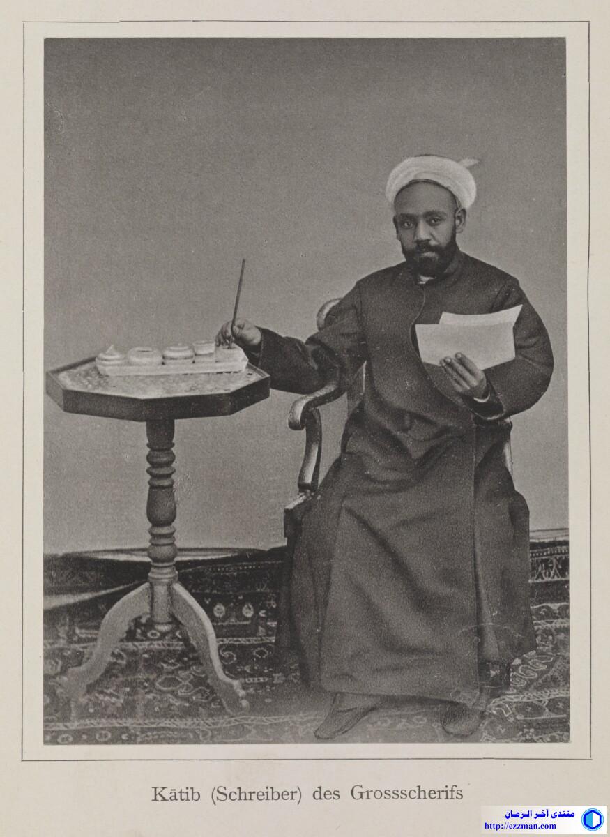 Content Genre/Subject Matter: This full-length seated portrait of a bearded man shows a scribe of the Grand Sharīf, who indicates his profession by posing with a piece of paper in his left hand while dipping his pen in inkwith his right. He wears a plain, dark-coloured outer robe fastened at his waist with a pale-coloured turban on his head. To his right a three-legged, octagonal table carries a rectangular tray of pots. The surface of the table may be inlaid. The negative has had hand-work applied, causing it to take on a soft-shaded quality in places. In particular, the man’s feet have been over-drawn due to overexposure at the lower edge of the photograph. Inscriptions: Printed above image, in ink: XIII Printed beneath image, in ink: 'Kātib (Schreiber) des Grossscherifs' A circular 'British Museum' blind stamp is located in the lower right corner. Extent and format 1 collotype print Physical characteristics Dimensions: 130 x 97 mm Format: 1 collotype print Condition: The print is in good condition. Foliation: ‘XIII’ Written in German in Latin script المصدر: هنا |