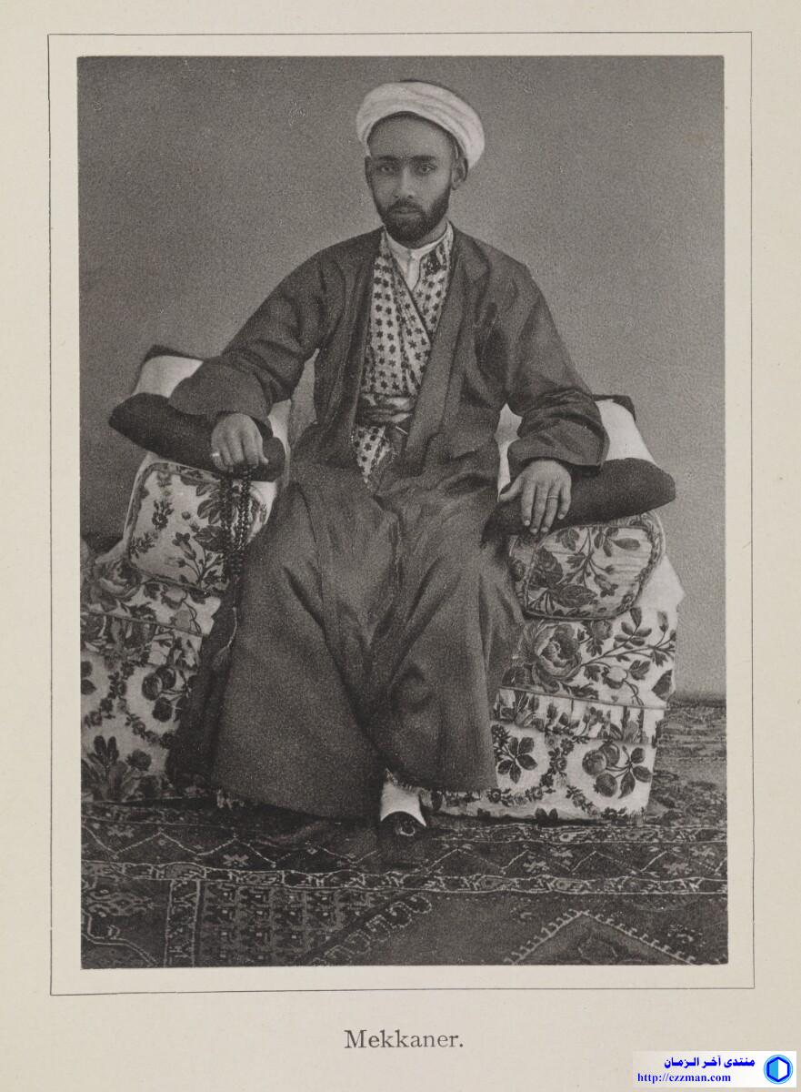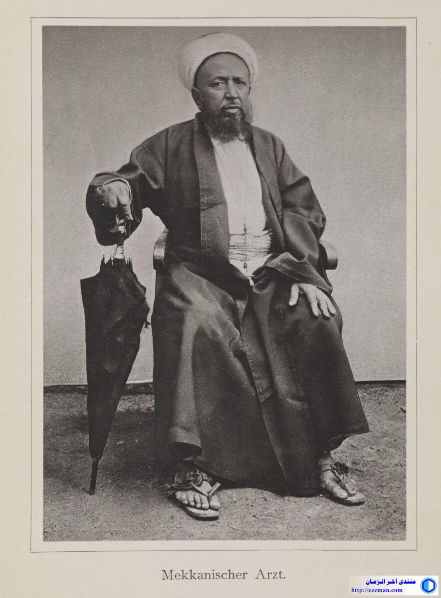 صورة طبيب في مكة، الراجح أنه الطبيب المصور السيد عبد الغفار الذي شارك كِرِسْتِيَانْ سنُوُك هِرْخُرُونْيَهْ في عمليات تصوير http://ezzman.com/up/do.php?img=4675 Content Genre/Subject Matter: This full-length seated portrait of a bearded man shows a Meccan doctor, likely the photographer al-Sayyid ʻAbd al-Ghaffār, who collaborated with the photographer Christiaan Snouck Hurgronje. He wears a plain, dark-coloured outer robe over a white buttoned undershirt and white cummerbund, with a pale-coloured turban on his head. In his right hand the doctor grips the handle of a dark-coloured umbrella or parasol. On his feet he wears knotted leather sandals. The negative does not appear to have had hand-work applied, except for the background, which may have been substituted. Inscriptions: Printed above image, in ink: XIV Printed beneath image, in ink: ‘Mekkanischer Arzt.’ A circular 'British Museum' blind stamp is located in the lower right corner. Extent and format 1 collotype print Physical characteristics Dimensions: 132 x 972 mm Format: 1 collotype print Condition: The print is in good condition. Foliation: ‘XIV’ Written in German in Latin script المصدر: هنا |