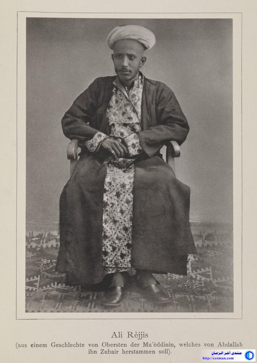 Content Genre/Subject Matter: This full length seated portrait shows Ali Rèjjis, described as a member of the dynasty of most senior muezzinīn (public criers who proclaim the hours of prayer from a minaret or roof of a mosque), supposed descendants of ʿAbd Allāh b. al-Zubayr, the first Muslim born at Medina after the hijra. He faces forward, looking towards the photographer. The man wears a dark-coloured outer robe over a check-patterned robe (see also 1781.b.6/27) and white turban on his head. On the little finger of his right hand he wears a ring and on his feet, polished leather shoes. The negative has had hand-work applied, causing it to take on a soft-shaded quality in places. In particular, the original background has been substituted completely. Inscriptions: Printed above image, in ink: XV Printed beneath image, in ink: Ali Rèjjis (aus einem Geschlechte von Obersten der Mu’èddinin, welches von Abdallah ibn Zubair herstammen soll). A circular 'British Museum' blind stamp is located in the lower right corner. Extent and format 1 collotype print Physical characteristics Dimensions: 128 x 90 mm Format: 1 collotype print Condition: The print is in good condition. Foliation: ‘XV’ Written in German in Latin script المصدر: هنا |
