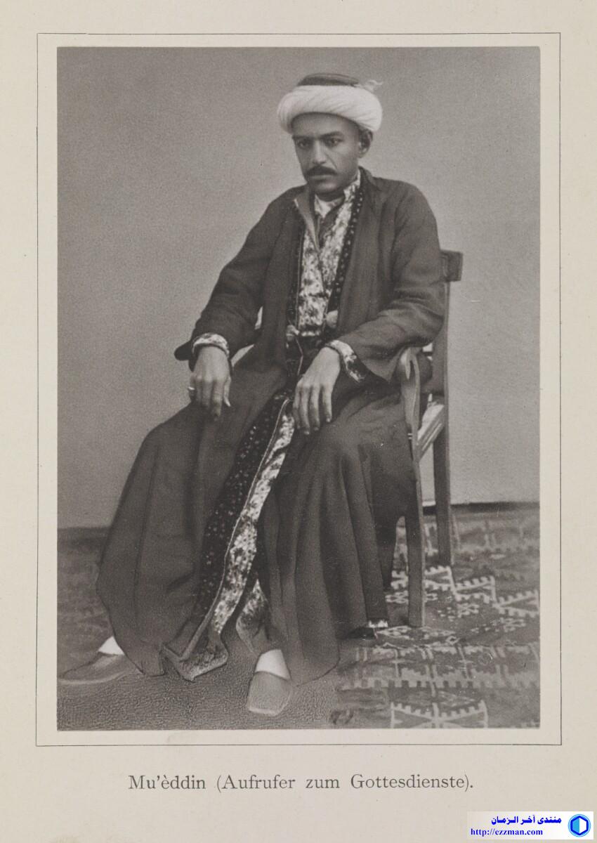 Content Genre/Subject Matter: This full-length seated portrait of a bearded man shows a muezzin, a public crier who proclaims the hours of prayer from a minaret or roof of a mosque. The man faces forward and looks towards the camera. In his right hand he holds the handle of a pale-coloured umbrella or parasol. He wears a plain, dark-coloured outer robe over a white buttoned undershirt or jalabiya, with a pale-coloured turban on his head. The negative has had hand-work applied, causing it to take on a soft-shaded quality in places. Inscriptions: Printed above image, in ink: XIII Printed beneath image, in ink: ‘Mu’èddin (Aufrufer zum Gottesdienste)’ A circular 'British Museum' blind stamp is located in the lower right corner. Extent and format 1 collotype print Physical characteristics Dimensions: 130 x 96 mm Format: 1 collotype print Condition: The print is in good condition. Foliation: ‘XIII’ Written in German in Latin script المصدر: هنا |