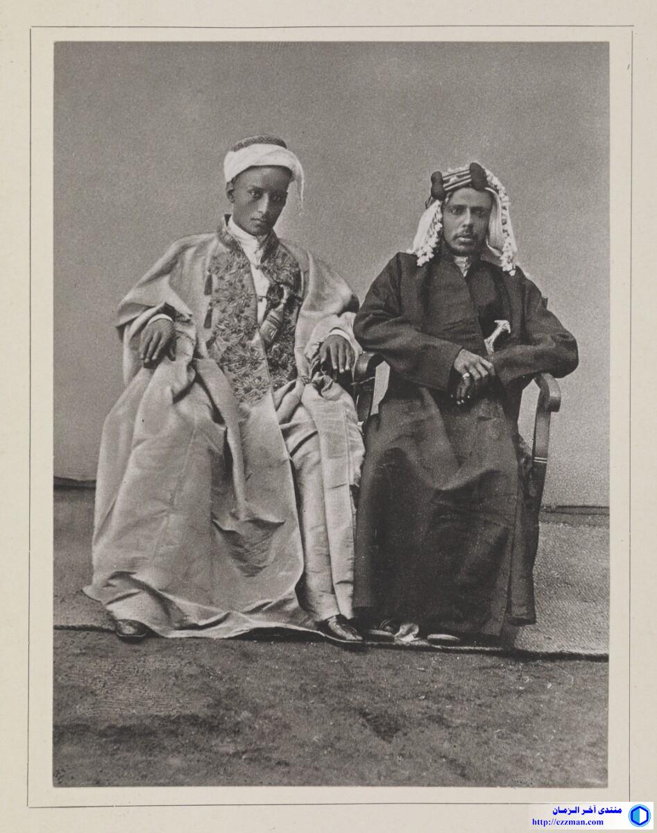 Content Genre/Subject Matter: This full length seated portrait shows two men, described in the title as ‘members of various shereef families,' i.e. descendants of Muhammad via his daughter Fatima. They face slightly to the left, looking forward. The man on the right wears a dark-coloured robe, a pale-coloured, tasselled keffiyeh held in place by a dark-coloured agal and sandals. At his waist a janbiya can be seen emerging from his robes and he wears a ring on his little finger. The man on the left wears a pale-coloured outer-robe that is heavily embellished, perhaps embroidered, along the lapels over a white robe. On his head he wears a white turban with a dark-coloured cap. He wears polished leather shoes and he, too, wears a janbiya, which emerges from under his robe at the waist. The negative has had hand-work applied, causing it to take on a soft-shaded quality in places. In particular, the background has been substituted, though the mat on which they are seated remains. Inscriptions: Printed above image, in ink: XVI A circular 'British Museum' blind stamp is located in the lower right corner. Extent and format 1 collotype print Physical characteristics Dimensions: 127 x 95 mm Format: 1 collotype print Condition: The print is in good condition. Foliation: ‘XVI’ Written in German in Latin script المصدر: هنا |