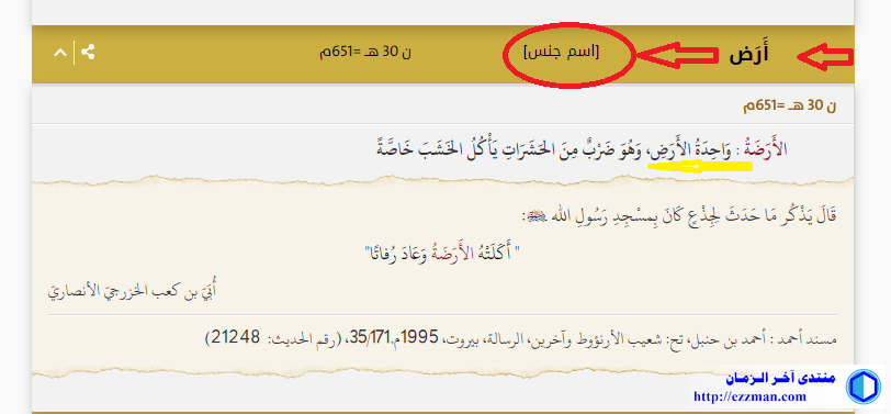 "الأَرَض بفتح الراء مصدر: (أَرَضَ) من باب علم المطاوع لأرَض من باب: ضرَب، يقال: أَرَضت الدابة الخشب بالفتح فأرِض بالكسر، فالأَرض بالسكون: الأكْل، والأرض بالفتح: التأثر من ذلك الفعل". [1] ــــــــــــــــــــــــــــــــــــــ [1] [د. أحمد مختار عمر - د. عبد العال سامر مكرم/معجم القراءات القرآنية/ 1997م/ عالم الكتب-القااهرة. / صفحة: 114/ 4] |
