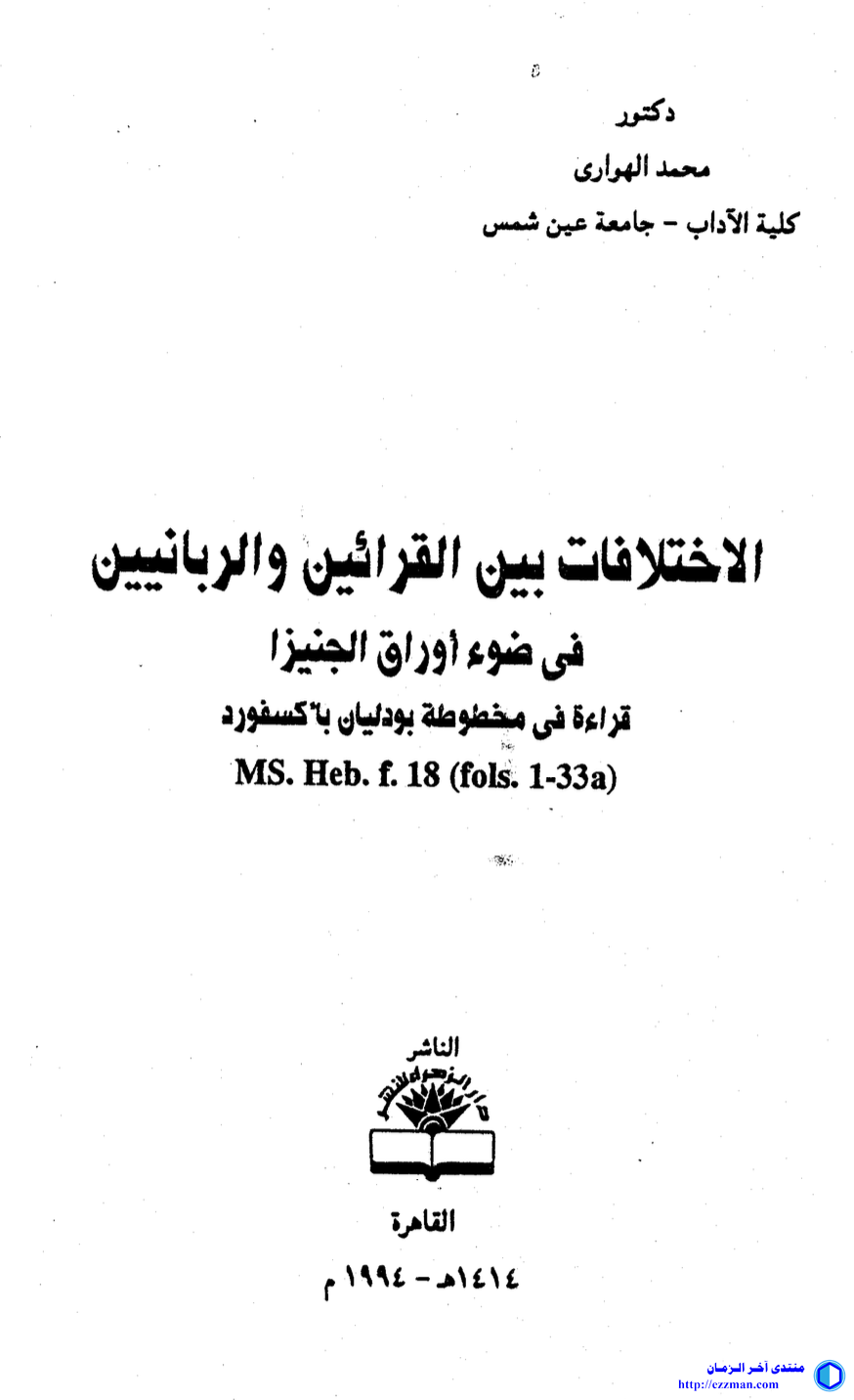 الاختلافات بين القرائين والربانيين في ضوء أوراق الجنيزا د. محمد الهواري https://files1.kutubypdf.com/pdf/kut...om_mah_069.pdf عن الكاتب: إن للكاتب د. محمد الهواري العديد من الكتب الأخرى والتي يمكنك أن تتصفحها وتحملها من خلال الرابط هذا كتب الكاتب د. محمد الهواري, وبالنسبة للصور تأكد من أن الصورة بالأعلى هي صورة كتاب الاختلافات بين القرائين والربانيين في ضوء أوراق الجنيزا للكاتب د. محمد الهواري, وإن لم تكن هناك صورة لا تنسى أن تقرأ وصف الكتاب بالأسفل. إذا إستمتعت بقراءة الكتاب يمكنك أيضاً مشاهدة وتحميل المزيد من الكتب الأخرى لنفس التصنيف, لموقعنا العديد من الكتب الإلكترونية, وتوجد به الكثير من التصنيفات داخله, وجميع هذه الكتب مجانية 100%, كما وأننا نعتبر من أفضل مواقع الكتب على الإطلاق, ومكتبة حاوية لجميع الكتب بجميع تخصصاتها, وبالنسبة لتصفح الموقع, فإن موقعنا (كتبي PDF) يعمل بصورة جيدة على الكمبيوتر والهواتف الذكية, وبدون أي مشاكل, وللبحث عن كتب أخرى عليك بزيارة الصفحة الرئيسية لموقعنا من هنا كتبي بي دي إف. نقلا عن ويكيبيديا: وصف الكتاب: يناقش الدكتور محمد الهواري، في هذه الدراسة بداية ظهور الحركات والتيارات والفرق في اليهودية منذ أيام يربعام حتى عنان، والتي اختلفت في العديد من الأصول وكان لها أثرًا بالغًا على العقيدة اليهودية، ويتعرض الكاتب هنا لمناقشة نشأة القرائيين وبداية الصراع مع الربانيين، والتطورات التي حدثت للقرائيين بعدعنان وظهور الاختلاف بينهم. ويناقش بالتحليل والتفسير مخطوطة من الجنيزا القاهرية محفوظة بمكتبة بودليان بأكسفورد والتي تمثل وجهة نظر الربانيين، في إطار الجدل الذي دار