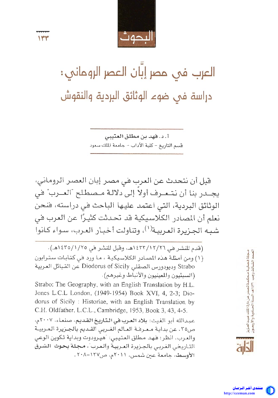 العرب في مصر إبان العصر الروماني: دراسة في ضوء الوثائق البردية والنقوش أ.د. فهد مطلق العتيبي قسم التاريخ - كلية الآداب - جامعة الملك سعود الدارة مجلية فصلية محكمة تصدر دارة الملك عبد العزيز العدد الثالث رجب 1436هـ ـ السانة الحادية والأربعون [صفحة: 133 - 180] https://lookaside.fbsbx.com/file/الع...UuW8owpi04o1JE