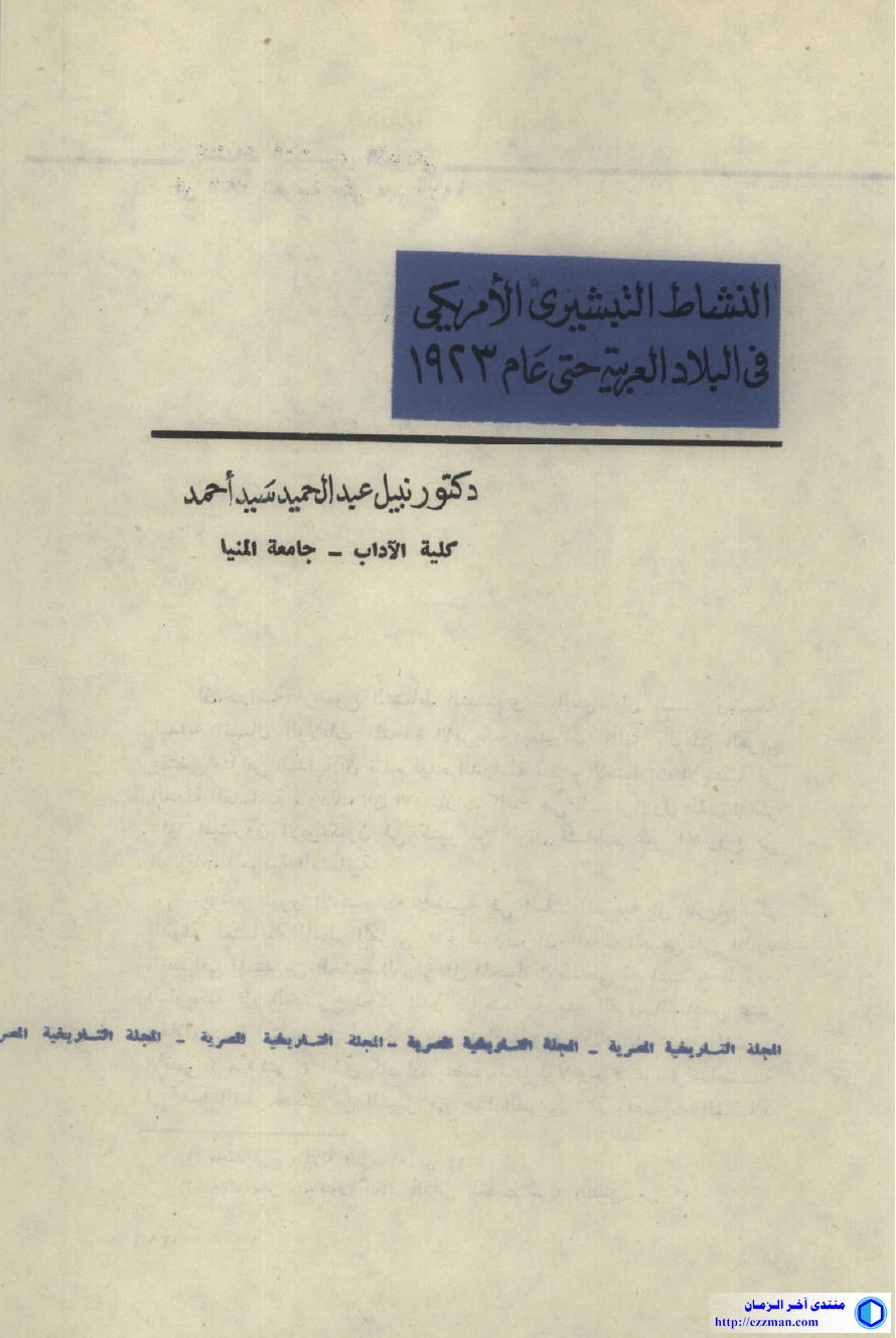 النشاط التبشيري الأمريكي في البلاد العربية حتى عام 1923 د. نبيل عبد الحميد سيد أحمد كلية الآداب - جامعة المنيا الجمعية المصرية للدراسات التاريخية SOCIETE EGYPTIENNE D'ETUDES HISTORIQUES المجلة التاريخية المصرية المجلد السابع والعشرون صفحة [216 - 278] https://archive.org/download/alnasha...AlTabshiri.pdf