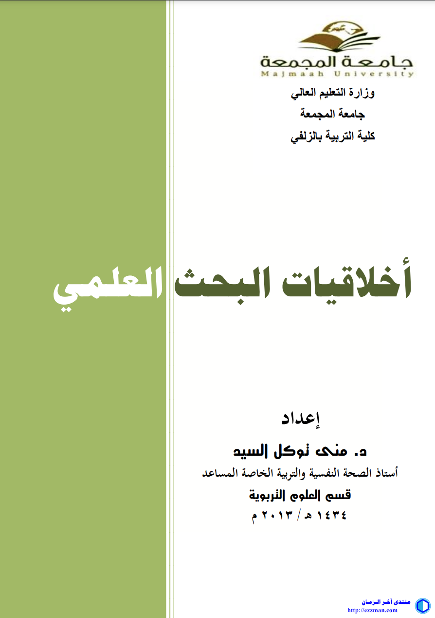 أخلاقيات البحث العلمي إعداد د. منى توكل السيد 1434هـ ـ 2013م جامعة المجمعة - الزلفي - بلد الحرمين الشريفين 26 صفحة https://ia800909.us.archive.org/1/it...9%8A%D8%AF.pdf