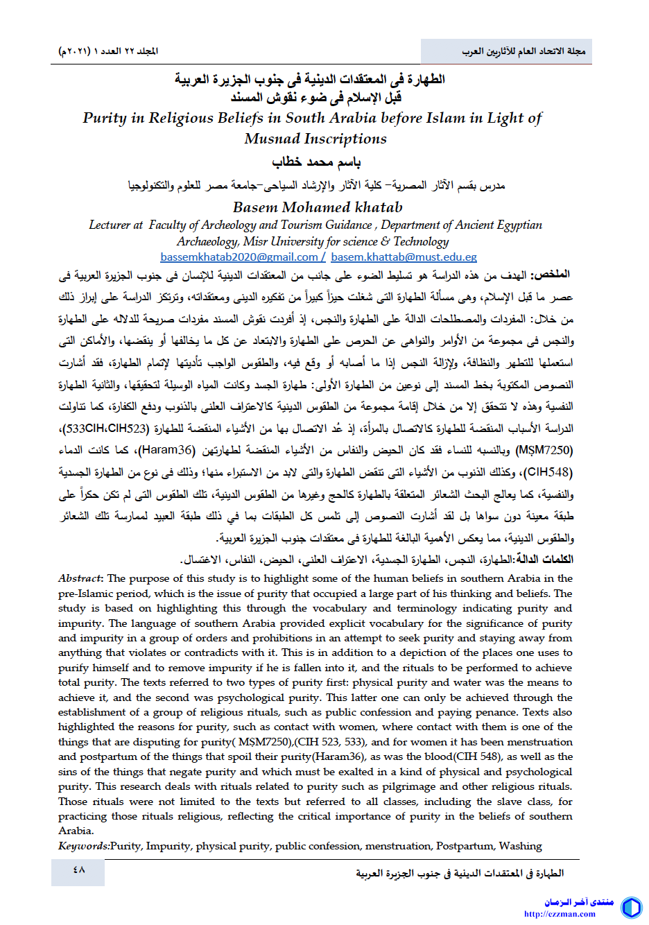 الطهارة في المعتقدات الدينية في جنوب الجزيرة العربية قبل الاسلام في ضوء نقوش المسند إعداد: أ. باسم محمد خطاب جامعة مصر للعلوم والتكنولوجيا مجلة الاتحاد العام للآثاريين العرب - الممجلد 22 العدد 1/ 2021م 31 صفحة [48 - 78] https://lookaside.fbsbx.com/file/%D8...xwKbMj5xOl4DRg