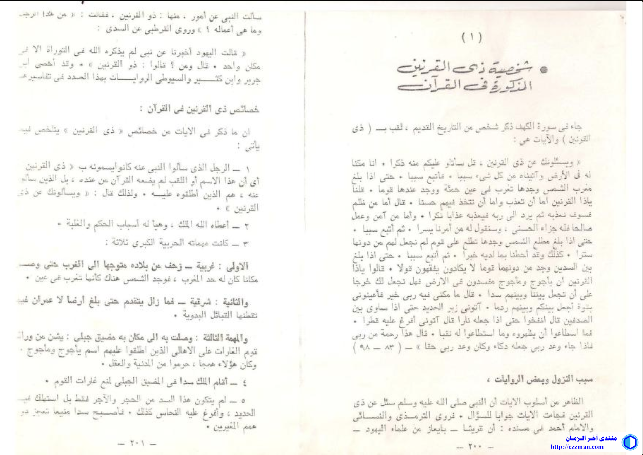جاء كلام الكاتب عبد المنعم أحمد النمرعن شخصية ذي القرنين كما ذكرتم في رسالة :"مولانا أبو الكلام آزاد. حياته و جهاده الديني و الوطني في سبيل تحرير الهند"، تصفحت الرسالة وهي موجودة على النت للتحميل، ووجدت أنه أفرد له فصل بعنوان "حديث القران والتاريخ عن غوروش"،وقد استخلصت فقط صفحات هذا الفصل في ملف.