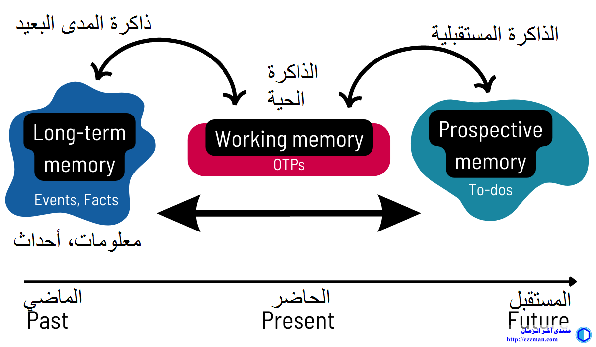 ففي قصة النبي يوسف عليه السلام، نوى الرجل الناجي من الإعدام على ذكر يوسف عليه السلام لكن حال الشيطان بينه وبين تذكر هذا الطلب. وكذلك في قصة موسى عليه السلام .. تدخل الشيطان حتى لا يتذكّر النبي عليه السلام الحوت. يقابل الذاكرة المستقبلية الذاكرة طويلة المدى (بغض النظر عن اصطلاحات المتخصصين)، وهي الذاكرة المسؤولة عن حفظ المعلومات التي يتعلمها ويحفظها الإنسان كالحقائق والتواريخ والأحداث ونحوها، وهذه تُستدعى منها المعلومات طواعية -إلا أن يتدخل عامل خارجي في عملها كالشيطان- .. في انتظار طرح بقيّة تفاصيل موضوع الذاكرة لمناقشة أعمق بإذن الله تعالى. اقتباس: