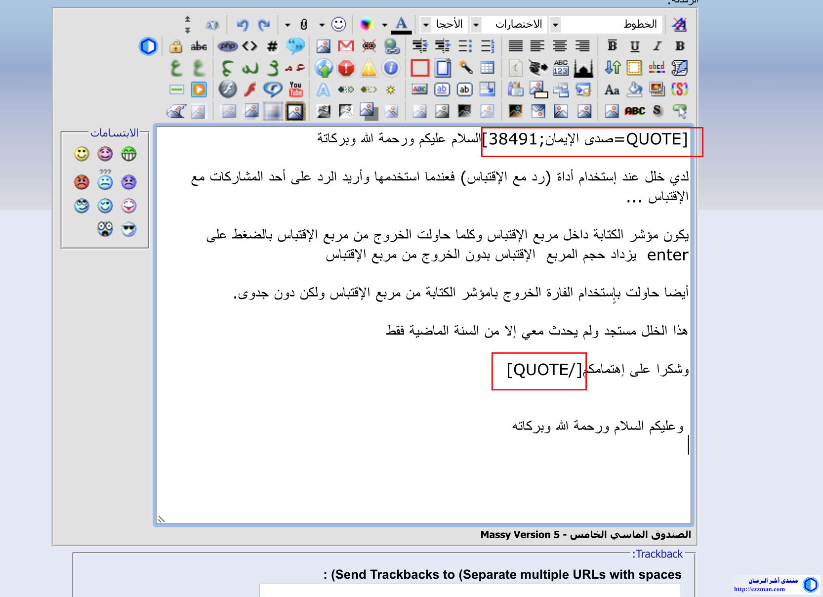 لدي خلل عند إستخدام أداة (رد مع الإقتباس) فعندما استخدمها وأريد الرد على أحد المشاركات مع الإقتباس ...
