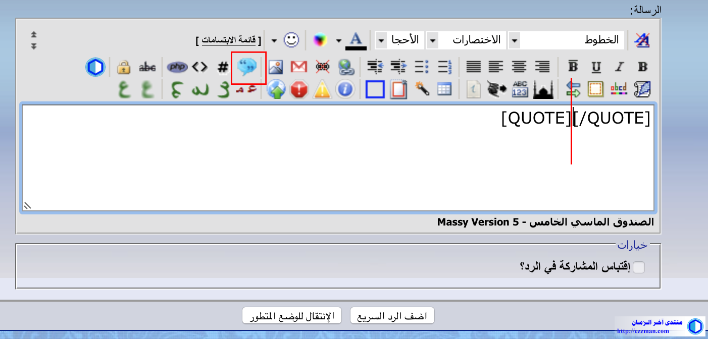 أما في حالة استخدام أيقونة [إدراج اقتباس] فانسخ الكلام المراد اقتباسه أولا .. ثم اضغط الأيقونة فسيظهر لك كود الاقتباس في صندوق الكتابة .. ثم ضع الكلام المنسوخ بين كودي الاقتباس كما في الصورة .. ثم للنشر اضغط أيقونة [أضف الرد]