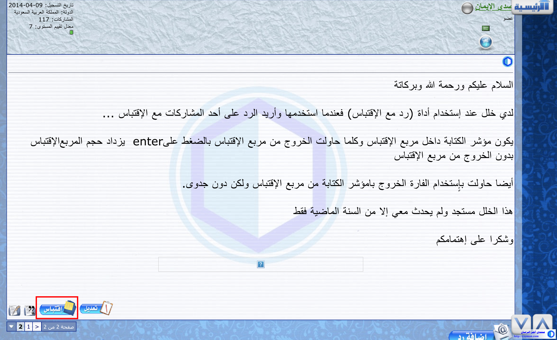 لدي خلل عند إستخدام أداة (رد مع الإقتباس) فعندما استخدمها وأريد الرد على أحد المشاركات مع الإقتباس ...